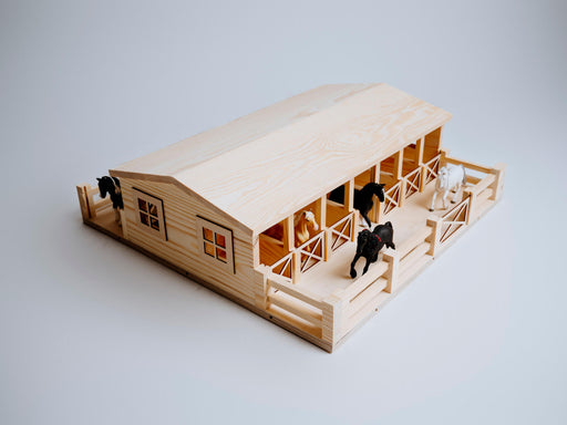 Tauche ein in die Welt unserer handgefertigten Pferdeställe aus Holz – detailverliebt gestaltet und mit viel Herz in unserer Werkstatt gefertigt. Jeder Pferdestall ist ein Unikat, das Kinder zum Träumen, Spielen und Geschichtenerzählen einlädt. Ob als Zuhause für kleine Holzpferde, als Bauernhof-Erweiterung oder als Mittelpunkt einer eigenen Spielwelt – unsere Pferdeställe aus Holz verbinden hochwertiges Handwerk mit kindlicher Fantasie. Gefertigt aus nachhaltigem, massivem Holz, überzeugen sie durch ihre robuste Bauweise, natürliche Haptik und zeitloses Design. So entstehen langlebige Spielwelten, die Generationen überdauern – perfekt für Kinder, die Pferde lieben und das kreative Rollenspiel entdecken möchten. Unsere Pferdeställe lassen sich außerdem wunderbar mit anderen HolzSpiration-Spielzeugen kombinieren – etwa mit einem Kletterbogen, einer Rollenrutsche oder weiteren Rollenspiel-Elementen. So entsteht ein harmonisches Spielsystem, das Bewegung, Fantasie und Nachhaltigkeit vereint.